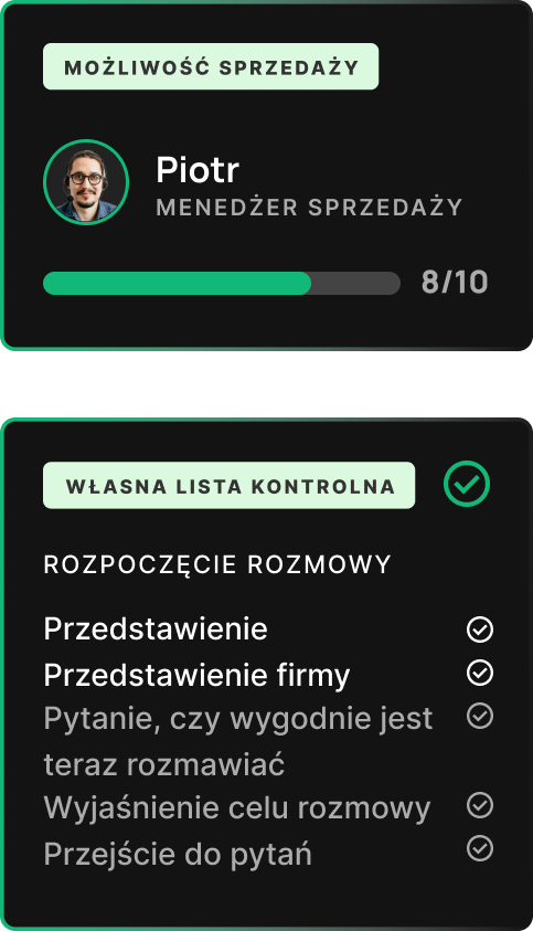 Stwórz własną checklistę z listą elementów, które należy kontrolować, aby zwiększyć produktywność Twojego zespołu. Monitoruj, czy menedżerowie przekazują klientom wszystkie ważne informacje i automatycznie przeglądaj raporty wydajności każdego pracownika.
