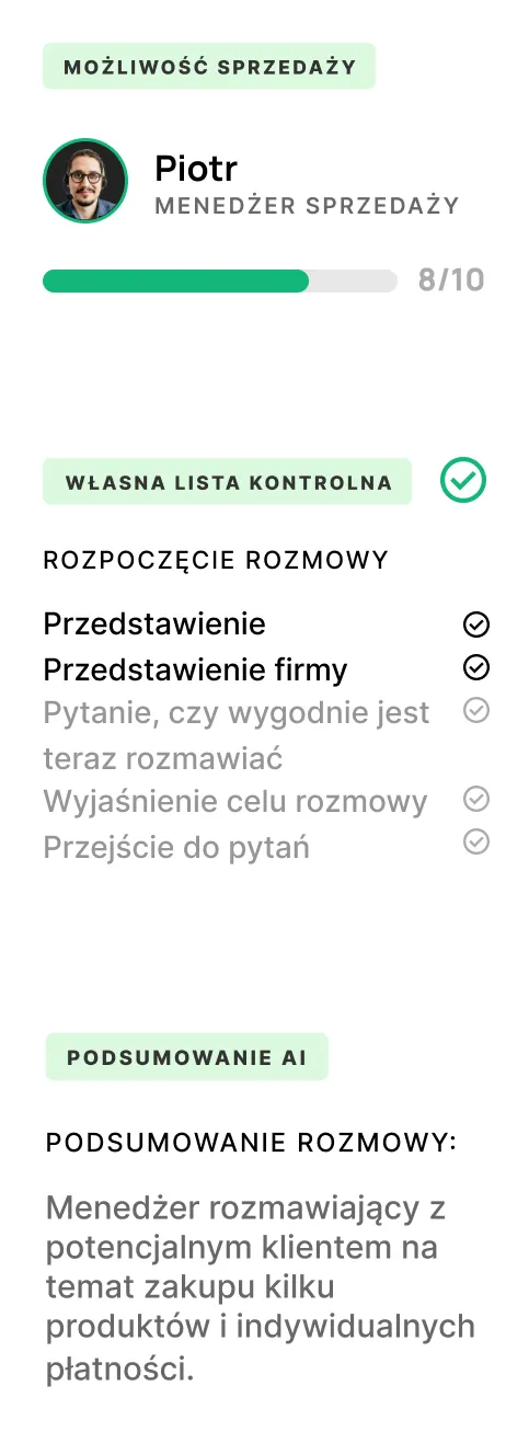Stwórz własną listę kontrolną rozmów, aby zwiększyć prawdopodobieństwo sprzedaży, a sztuczna inteligencja sprawdzi, czy menedżerowie postępują zgodnie z nią oraz dostarczy raport na temat wydajności każdego pracownika.