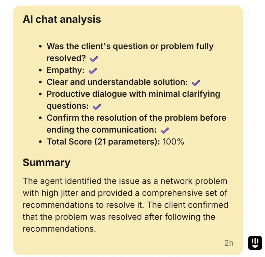 Також AI для бізнесу може контролювати, наскільки ефективно спеціалісти комунікують з клієнтами в рамках виконання тікету. В кінці розмови штучний інтелект надає технічному спеціалісту рекомендації, які скіли йому треба покращити.
