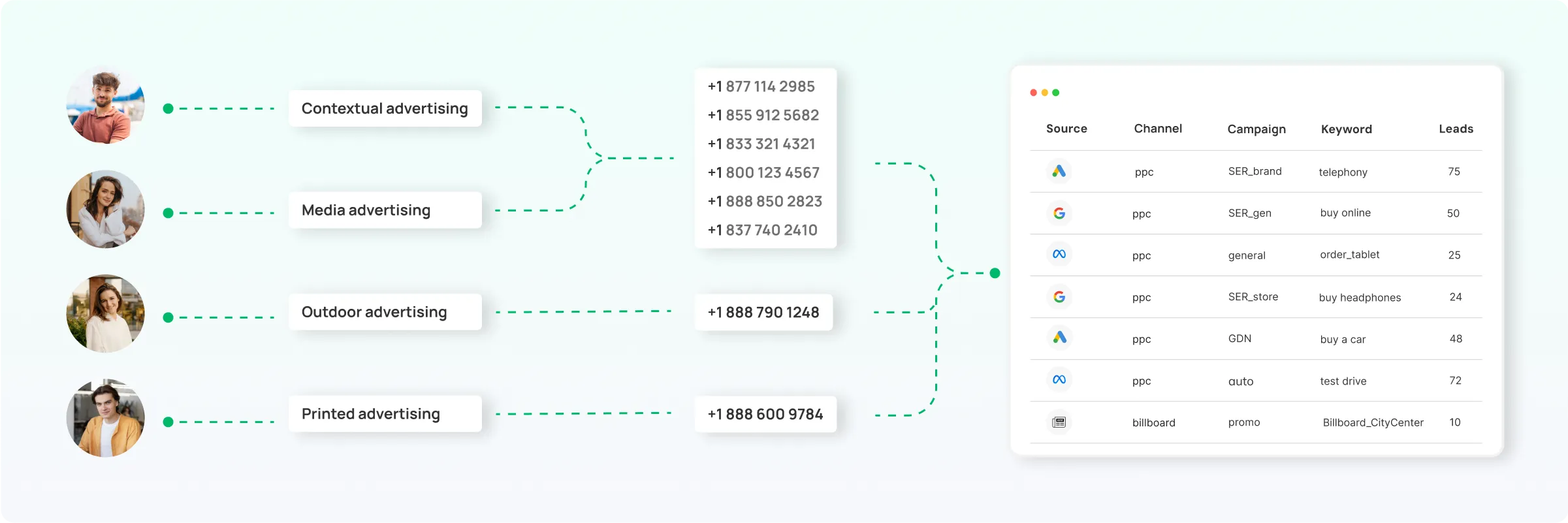 A separate pool of numbers is assigned to each advertising channel. This ensures that even a sudden spike in traffic on one channel won’t distort the statistics of the others.