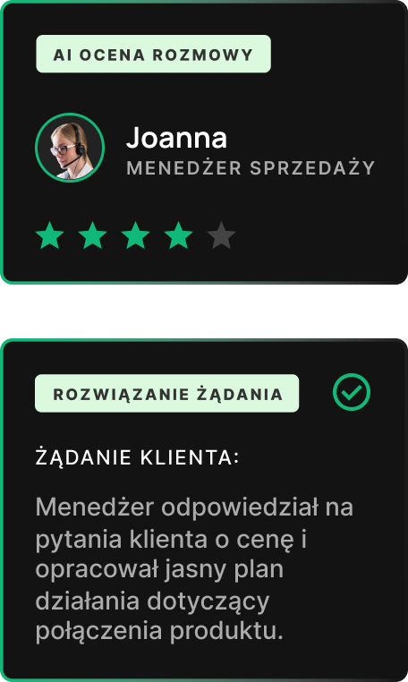Analizuje każde połączenie przychodzące i wychodzące, oceniając skuteczność komunikacji, zgodność ze standardami i obsługę klienta.
