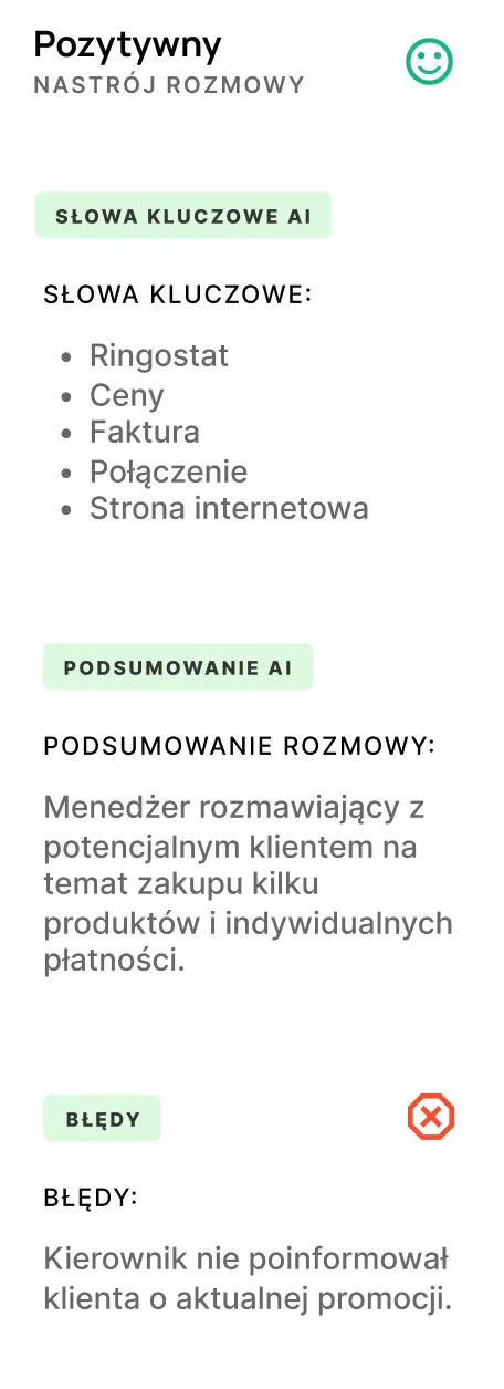 Natychmiast zrozum, jak przebiegała rozmowa — sztuczna inteligencja zapewni podsumowanie rozmowy i pokaże, w jakim nastroju byli zarówno operator, jak i klient.
