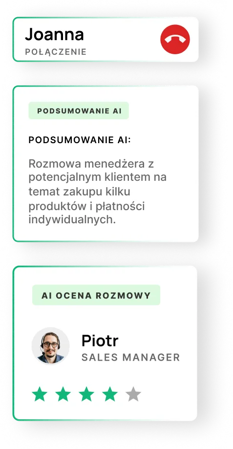 Sztuczna inteligencja rozpoznaje treść i nastrój rozmowy, wyodrębnia kluczowe frazy, tworzy podsumowanie i rekomendacje. Menedżerowie pracują szybciej, a kierownicy widzą jakość komunikacji w liczbach.