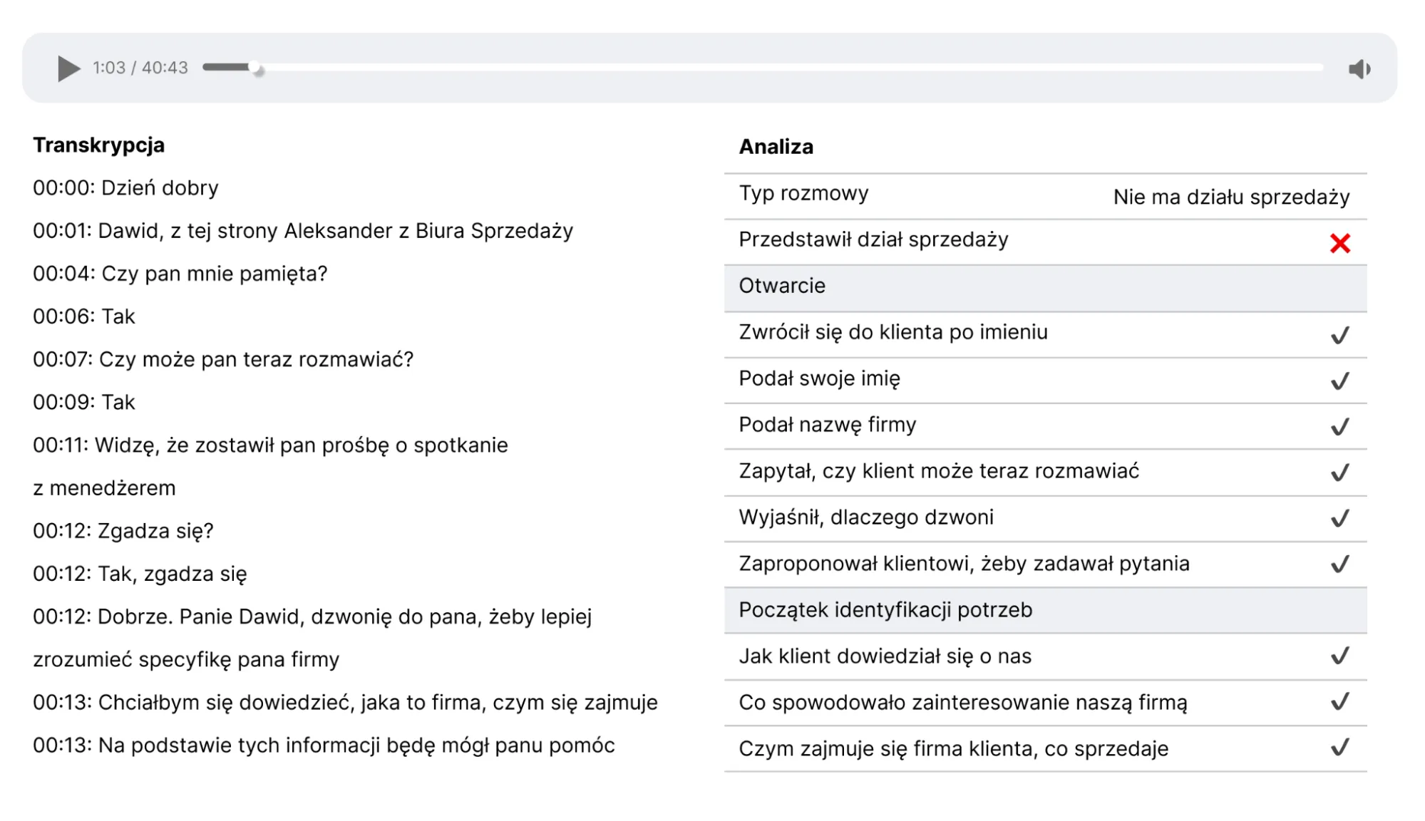 Dodatkowo sztuczna inteligencja Ringostat może automatycznie analizować rozmowy, transkrybować je i wskazywać kluczowe momenty w komunikacji z klientem.