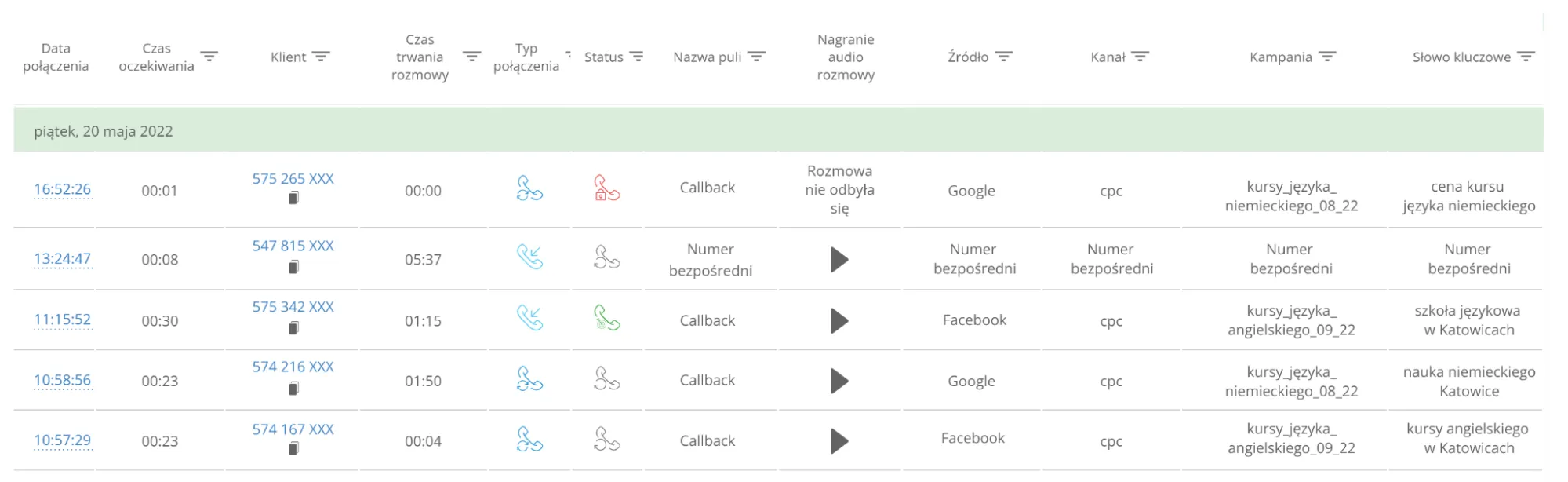 Dzięki integracji z CRM każdy lead z callbacku trafia bezpośrednio do systemu z pełną historią wizyt, kampanią i słowem kluczowym.