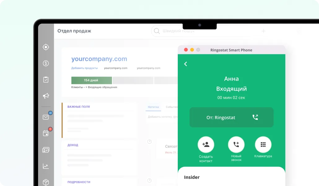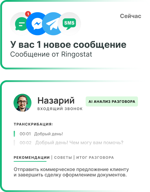Ringostat легко интегрируется с CRM, аналитическими сервисами, мессенджерами и рекламными платформами. Все звонки автоматически фиксируются в CRM, передаются в аналитику и привязываются к источникам рекламы — вы видите полную картину пути клиента: от первого клика до сделки.