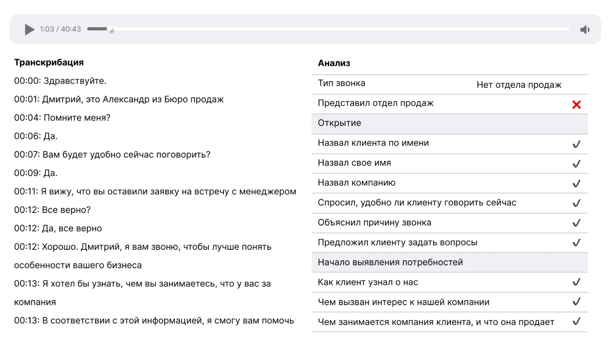 Дополнительно искусственный интеллект Ringostat может автоматически анализировать разговоры, транскрибировать их и указывать ключевые моменты в коммуникации с клиентом.