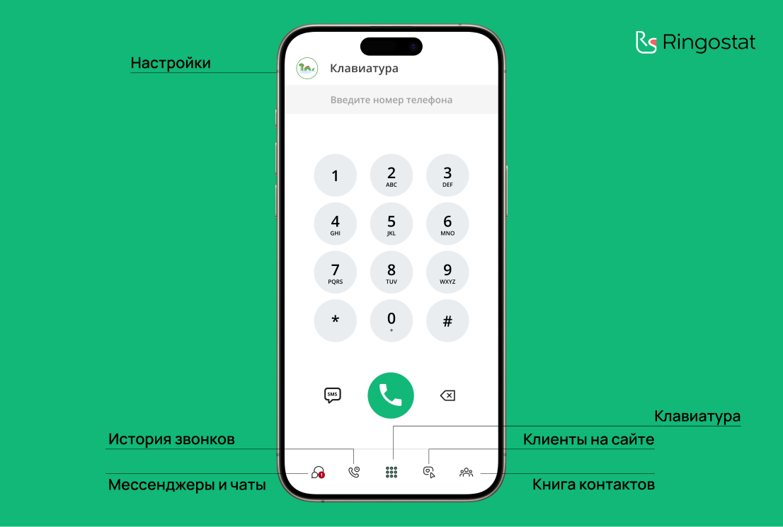 Если ваши менеджеры используют в работе не только компьютер, но и телефон, подключите Ringostat Smart Phone. Приложение имеет версии для Windows, macOS, iOS, и Android. Оно позволяет обрабатывать звонки и сообщения в едином интерфейсе, а также имеет доступ к real-time аналитике. Эти коммуникации не останутся вне поля зрения Ringostat AI и он сможет их проанализировать.
