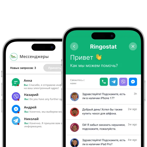 Онлайн-чат и мессенджеры (Viber, Telegram, Messenger) объединены в одном виджете. Все обращения поступают в приложение Ringostat Smart Phone, связанное с телефонией и CRM — без хаоса и потери клиентов.