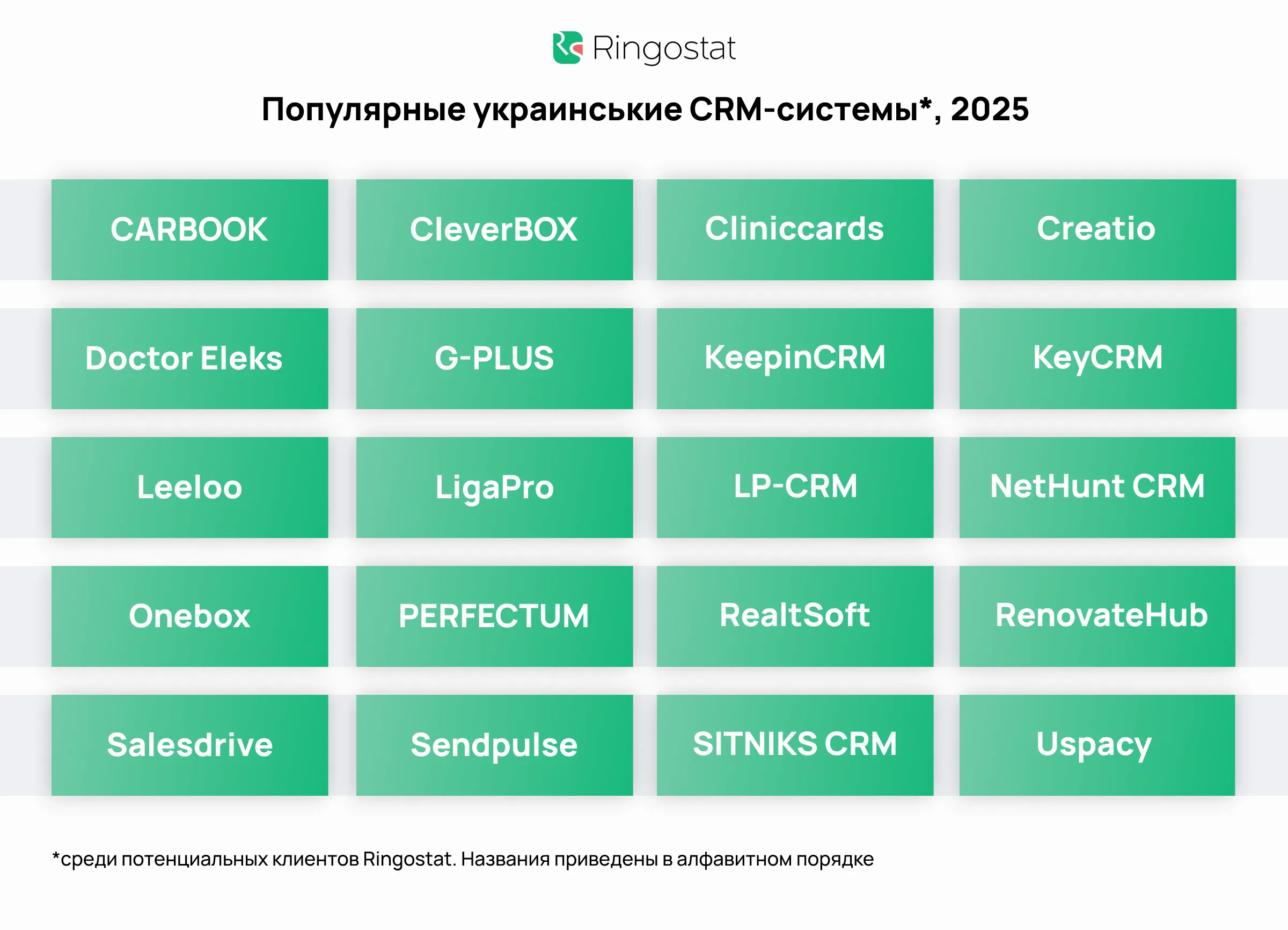 В 2025 году потенциальные клиенты Ringostat выбирали среди широкого спектра украинских CRM-систем. Разница между отдельными решениями в перечне незначительна, поэтому мы приводим 20 украинских CRM, которые бизнес чаще всего выбирает в нашей выборке.