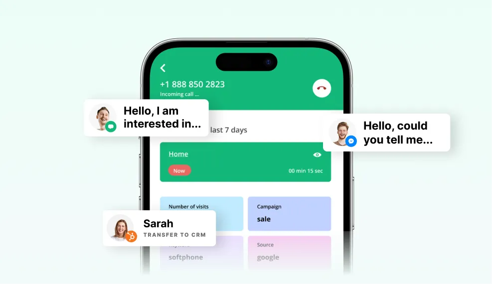 A mobile and desktop app to handle all customer interactions — calls and messages — in one place. Everything you need at hand: one-click access to CRM, contact history, and valuable customer insights such as traffic source, visit frequency, and visited pages.