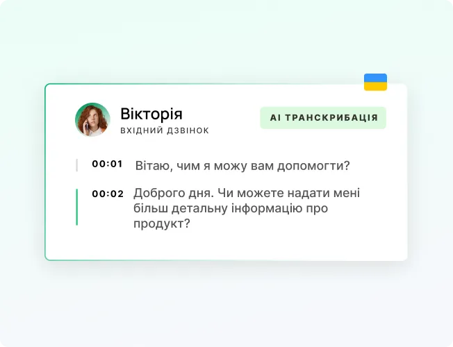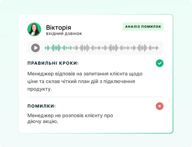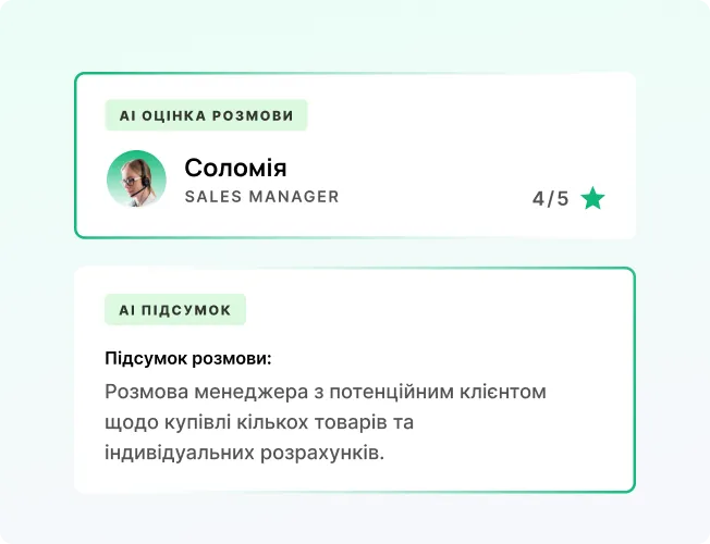 AI автоматично аналізує всі дзвінки команди, знаходить помилки й сильні сторони менеджерів та формує готові підсумки розмов. Ви бачите повну картину комунікацій без необхідності щоденного прослуховування.