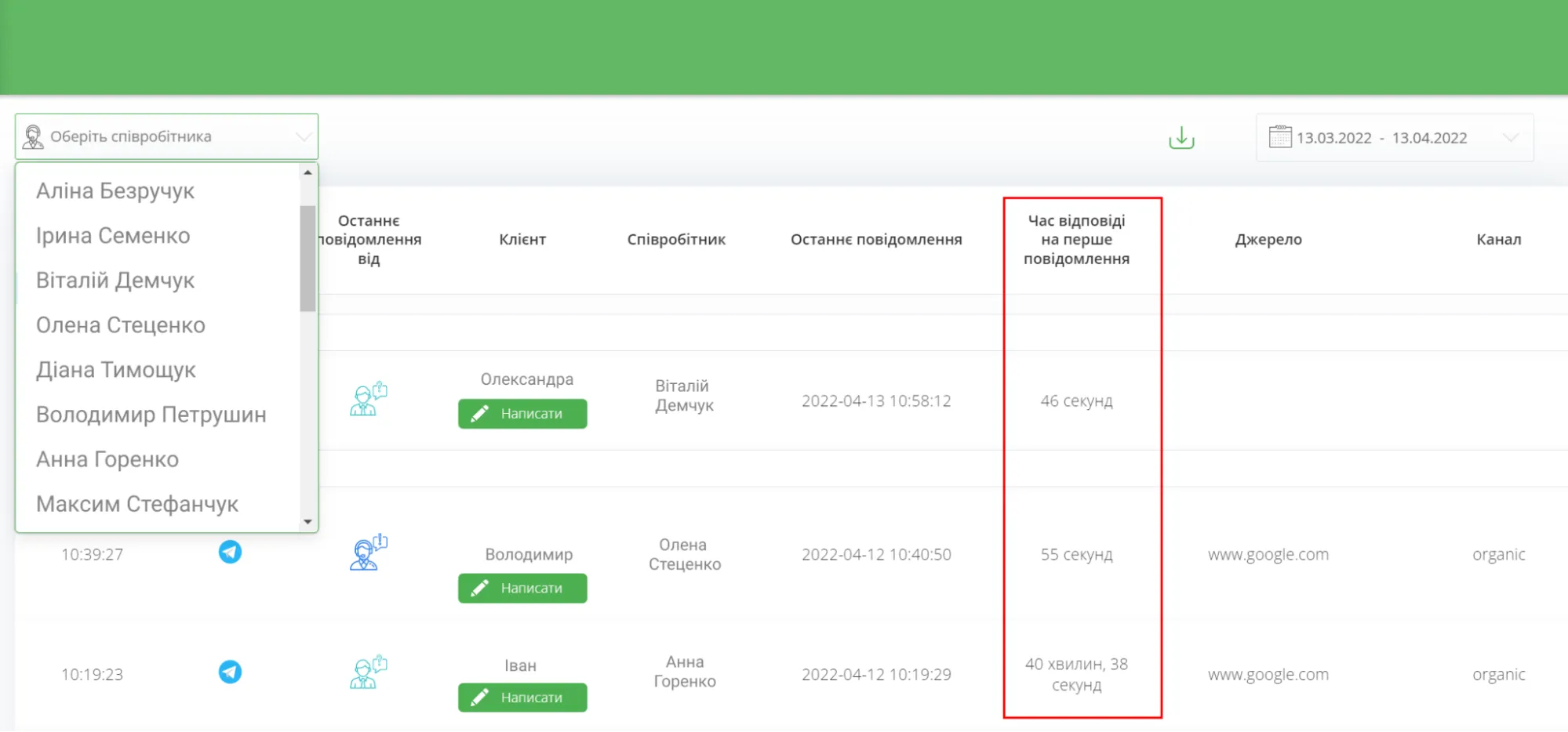 Менеджер, відкриваючи діалог, одразу бачить повну історію: коли клієнт заходив на сайт, з якої реклами прийшов, що питав раніше, з ким спілкувався. Це усуває ситуації, коли клієнт чує «Повторіть, будь ласка, я не знаю, що ви казали моєму колезі». Усі менеджери мають повний контекст і можуть продовжити розмову з того місця, де її зупинив попередник.