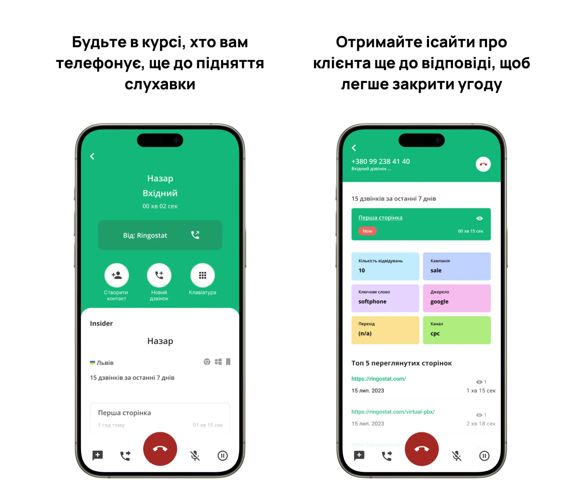 Ringostat Smart Phone показує ці дані у браузері ще до того, як менеджер відповість на дзвінок чи повідомлення. Не потрібно перемикатися між вкладками — уся інформація перед очима.