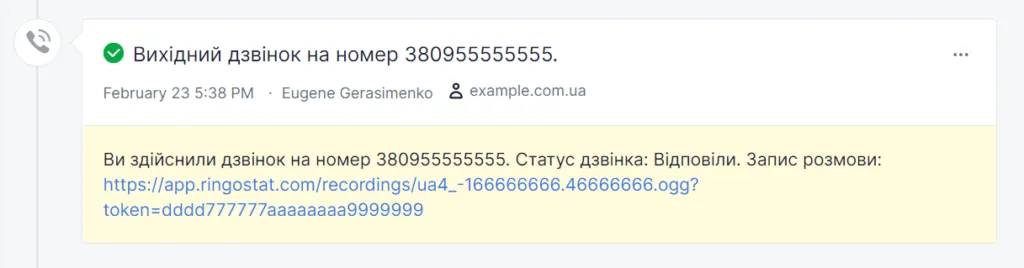 Також в CRM автоматично створюється контакт, якщо користувач телефонує вперше, угода та прикріплюється аудіозапис дзвінка до карточки клієнта. Якщо виклик було пропущено, то також додається завдання «Передзвонити» з дедлайном.