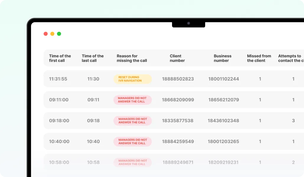- reduce the number of missed calls: identify and eliminate the reasons for missed calls, set up notifications on missed calls by email and SMS, etc.;