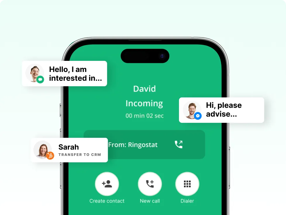All customer messages from every channel go straight into the Ringostat Smart Phone app, fully integrated with your phone system and CRM. Respond instantly to customer inquiries and increase sales without the chaos of switching between tools.