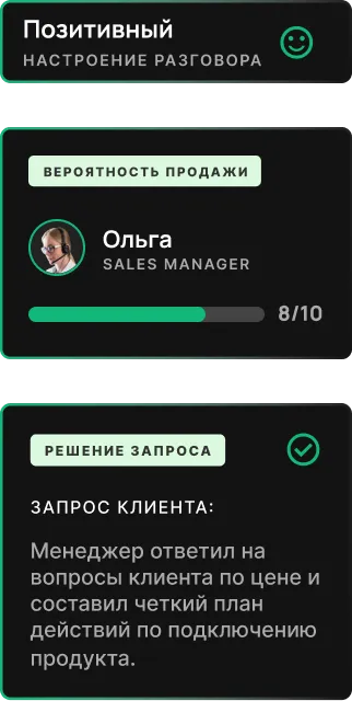Благодаря глубинному анализу от ИИ вы сможете легко получать ценные данные о каждом разговоре, что поможет лучше понимать потребности клиентов и совершенствовать работу менеджеров.